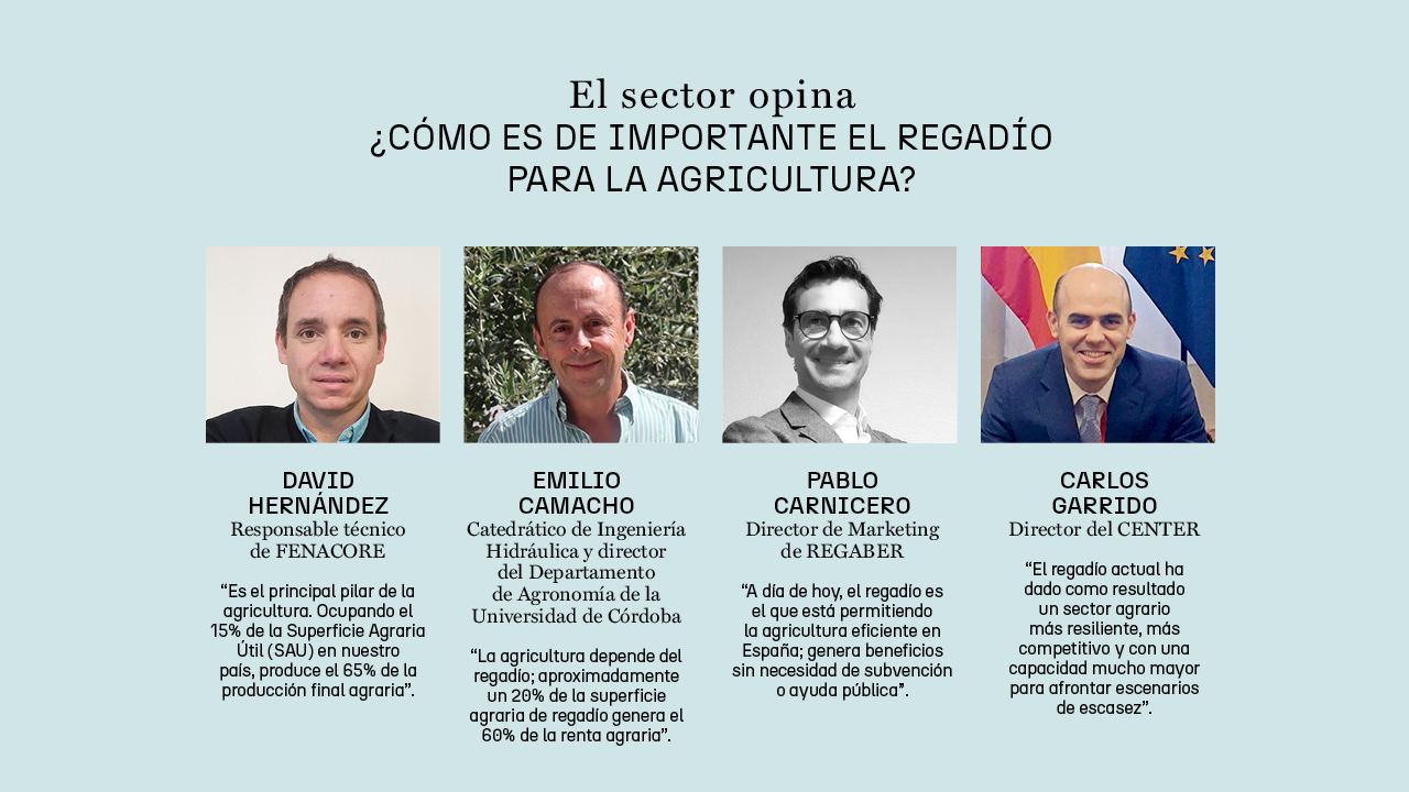 Emilio Camacho, catedrático de Ingeniería Hidráulica y director del Departamento de Agronomía de la Universidad de Córdoba, explica que, “ahora mismo la agricultura depende del regadío; aproximadamente un 20% de la superficie agraria que es de regadío genera prácticamente el 60% de la renta agraria. Todos los indicadores son a favor del regadío y no se entiende la agricultura en España sin él”.